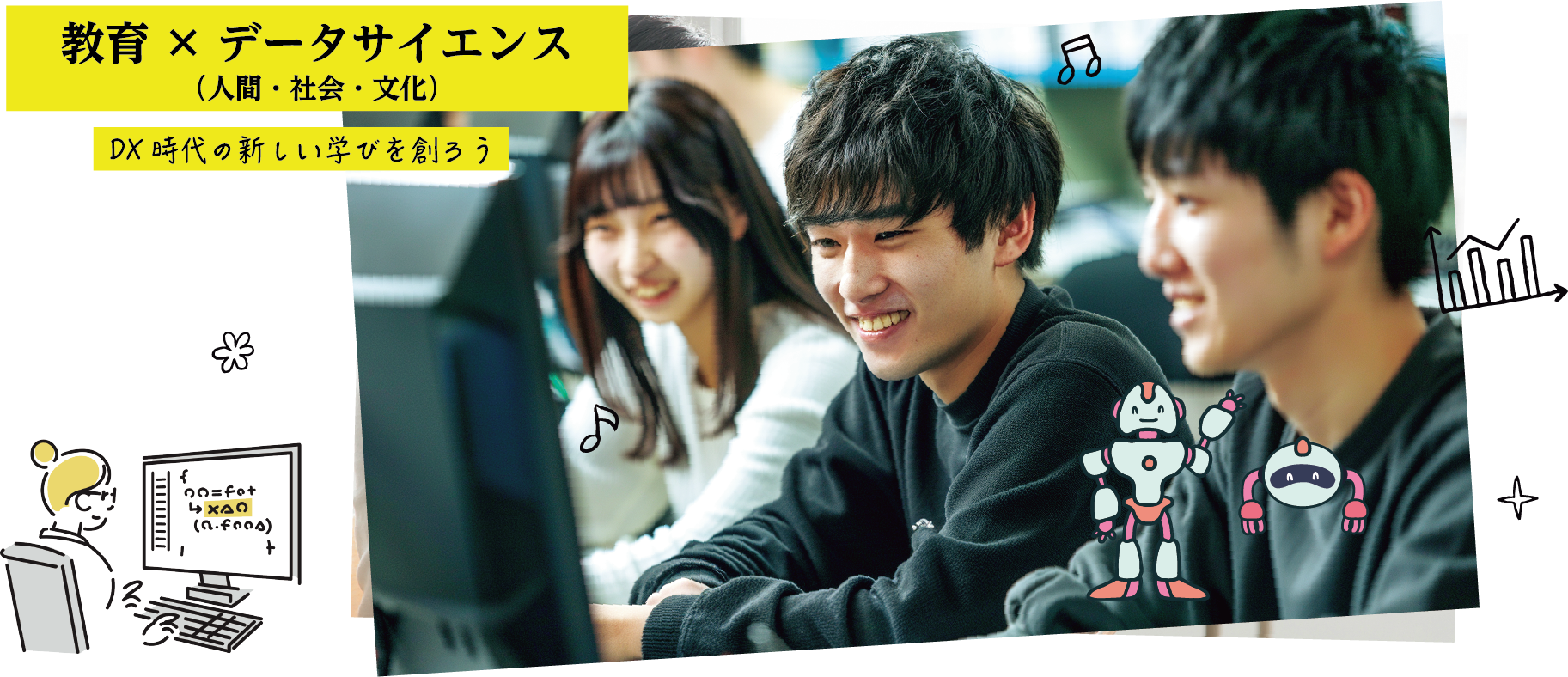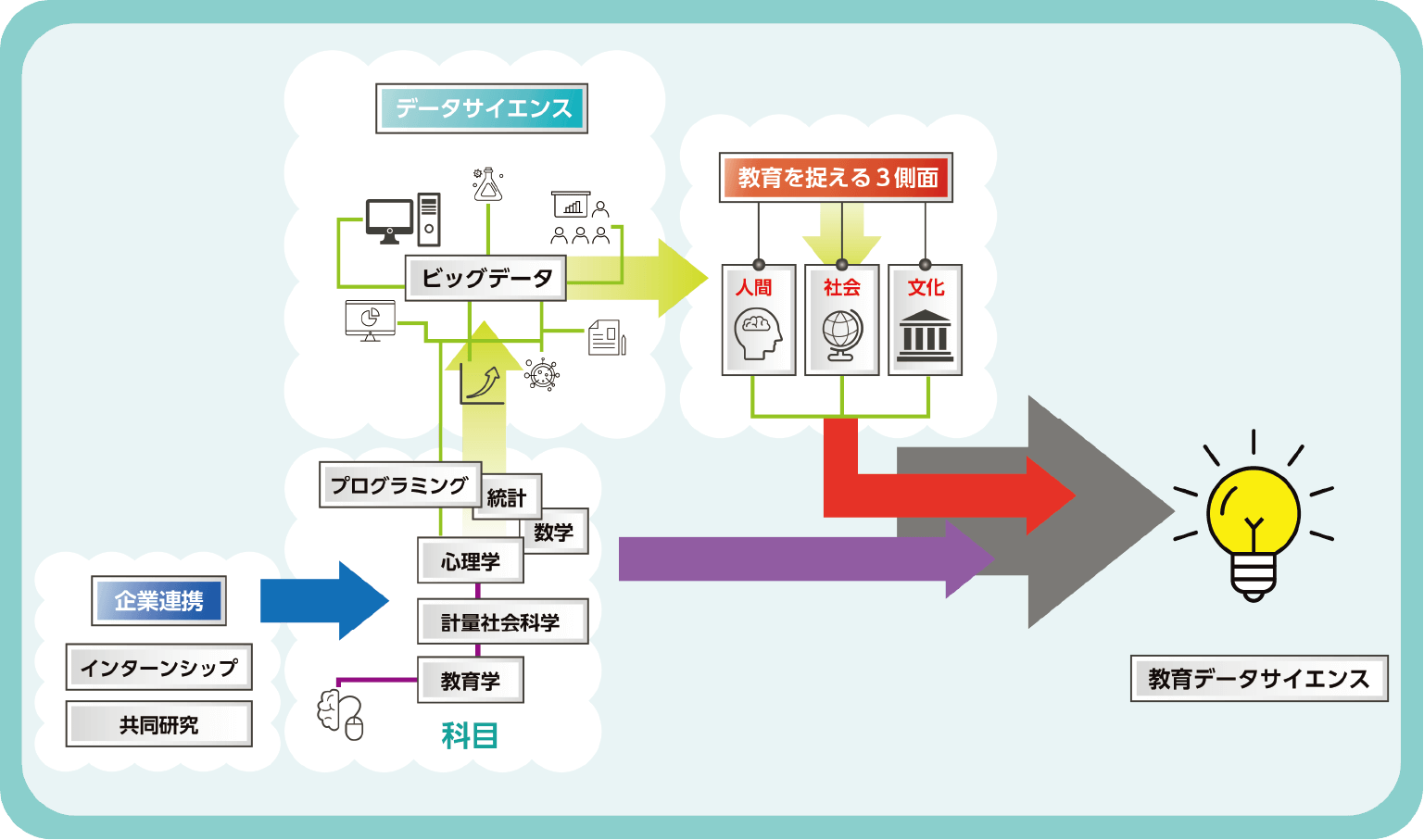「人間・社会・文化」の三つの視点に立脚したデータサイエンス系科目と、教育に関わる様々な科目の融合を目指します。